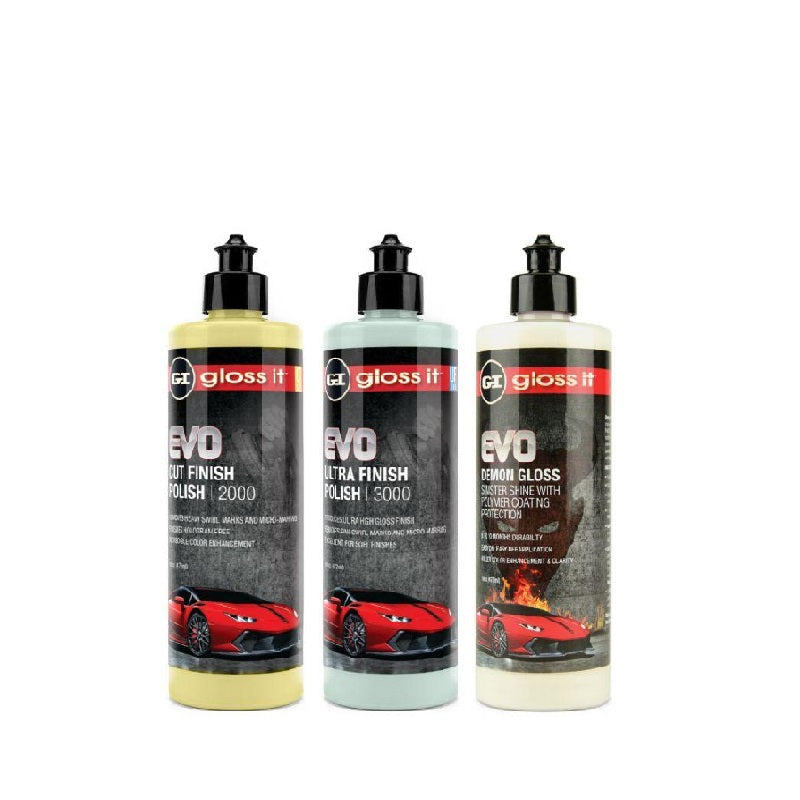This the perfect polishing kit for the weekend warrior detailer or professional detailer that's looking to detail by hand not machine. These polishes offer the latest in micro abrasive technology for removing fine swirl marks, scratches and water spots. This kit includes our specific and blue waxing, yellow polishing and orange foam fine cutting hexi sponges which color match to the three evo polishes for plug and play application. The EVO 1500, EVO 2000 and EVO3000 are easily applied by hand and work wet providing a light residual film with zero dust and easy removal with one of our gloss it premium edgeless micro fiber towels and our world class detail spray gloss enhancer. Gloss it has spent the past 2 decades perfecting the perfect paint finish and ensures all our detail products of the highest quality with 110% money back guarantee. Be sure to post a review after using our killer car care products!