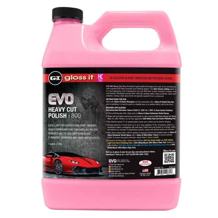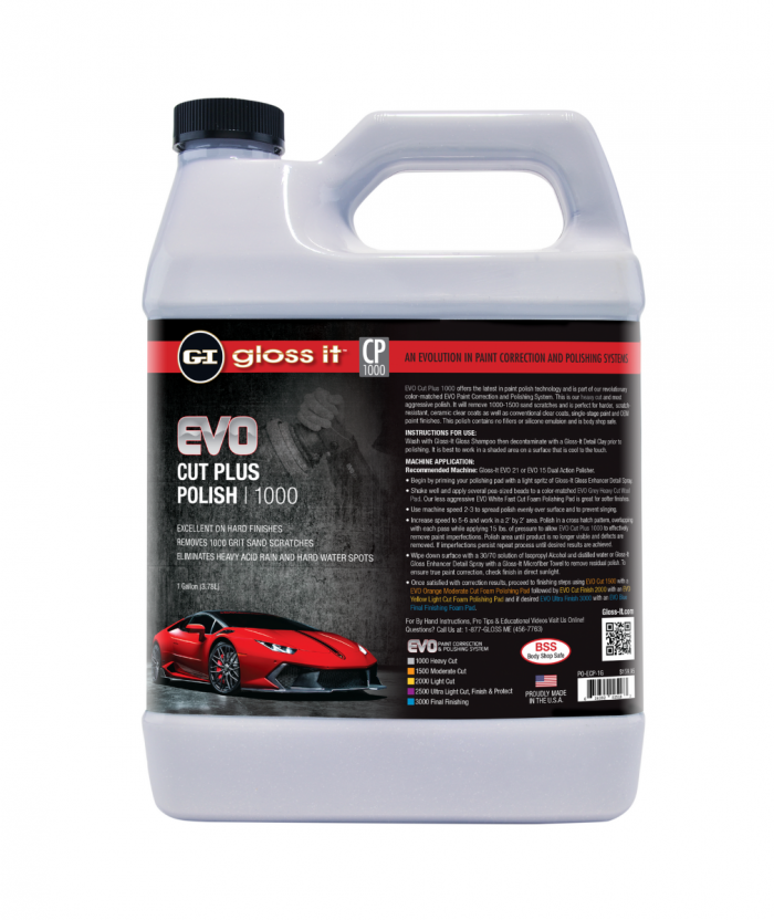 The first true heavy cut polish that truly diminishes on hard paint. Excellent for removing wet sanding scratches from 1000 to 2000 grit. Gloss-It EVO Cut Plus Polish 1000 offers the latest in paint polish technology and is a part of our revolutionary color matched EVO Paint Correction and Polishing System.