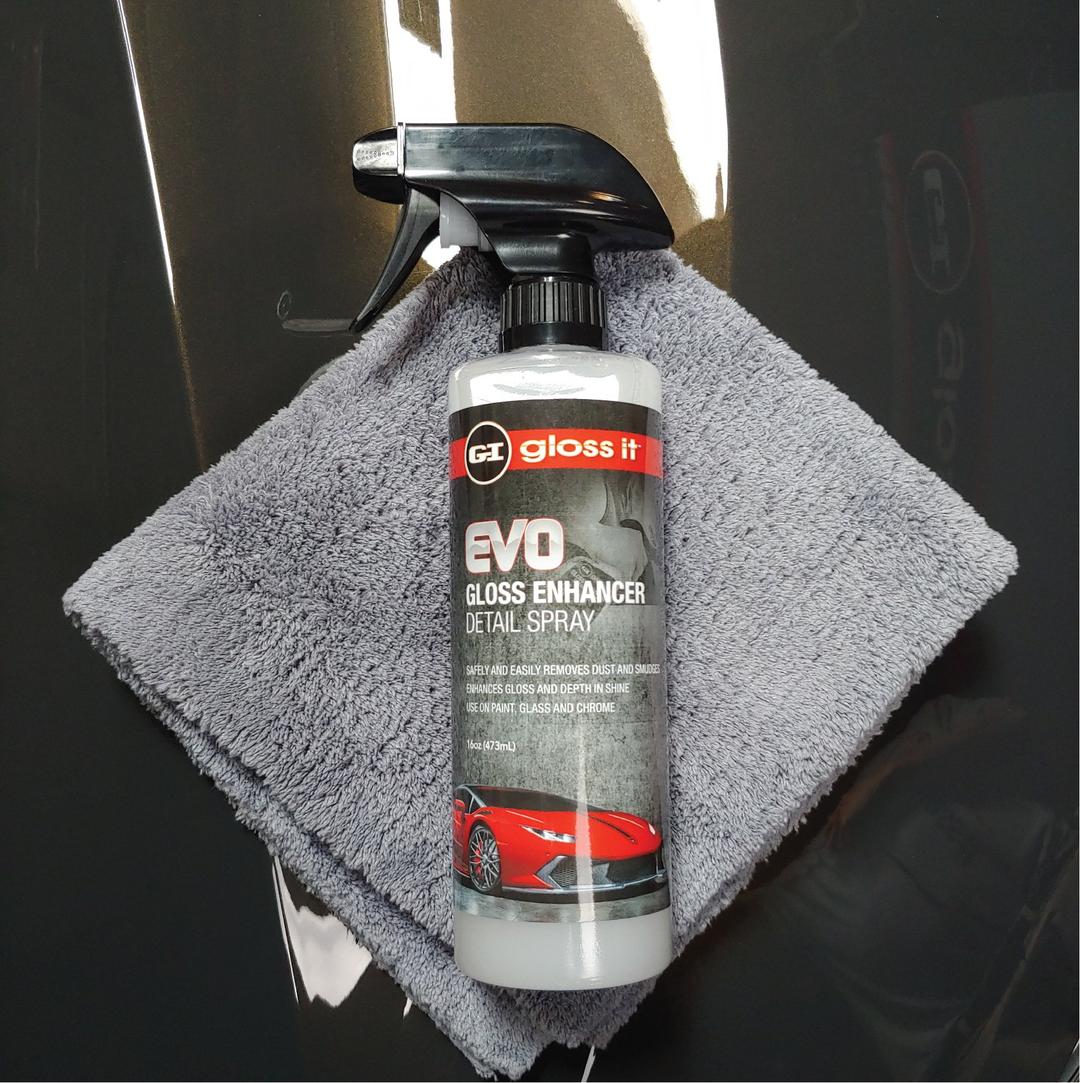 To begin fold a Premium Double Plush or Ultra Plush Edgeless Microfiber Towel into quarters then lightly mist the Gloss Enhancing Detail Spray onto panel or portion of a panel.